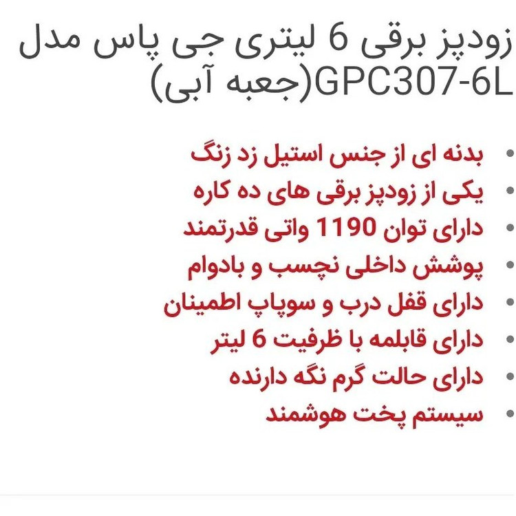 جی پاس ده کاره کارتون آبی زود پز بخارپز آرام پز کیک پز نان پز تخم مرغ پز..... جنس بدنه:از جنس استیل ضد زنگ کارایی فوق العاده عدم داغ شدن بدنه حین استفاده قفل شدن درب تا زمان پخت کامل و اتمام پخت عدم باز شدن درب تا تخلیه کامل بخار ظرفیت:6لیتر جنس کاسه داخل جی پاس: سرامیکی دارای واشر سوپاپ زاپاس کارایی خیلی خوب و راحتی آشپزی
